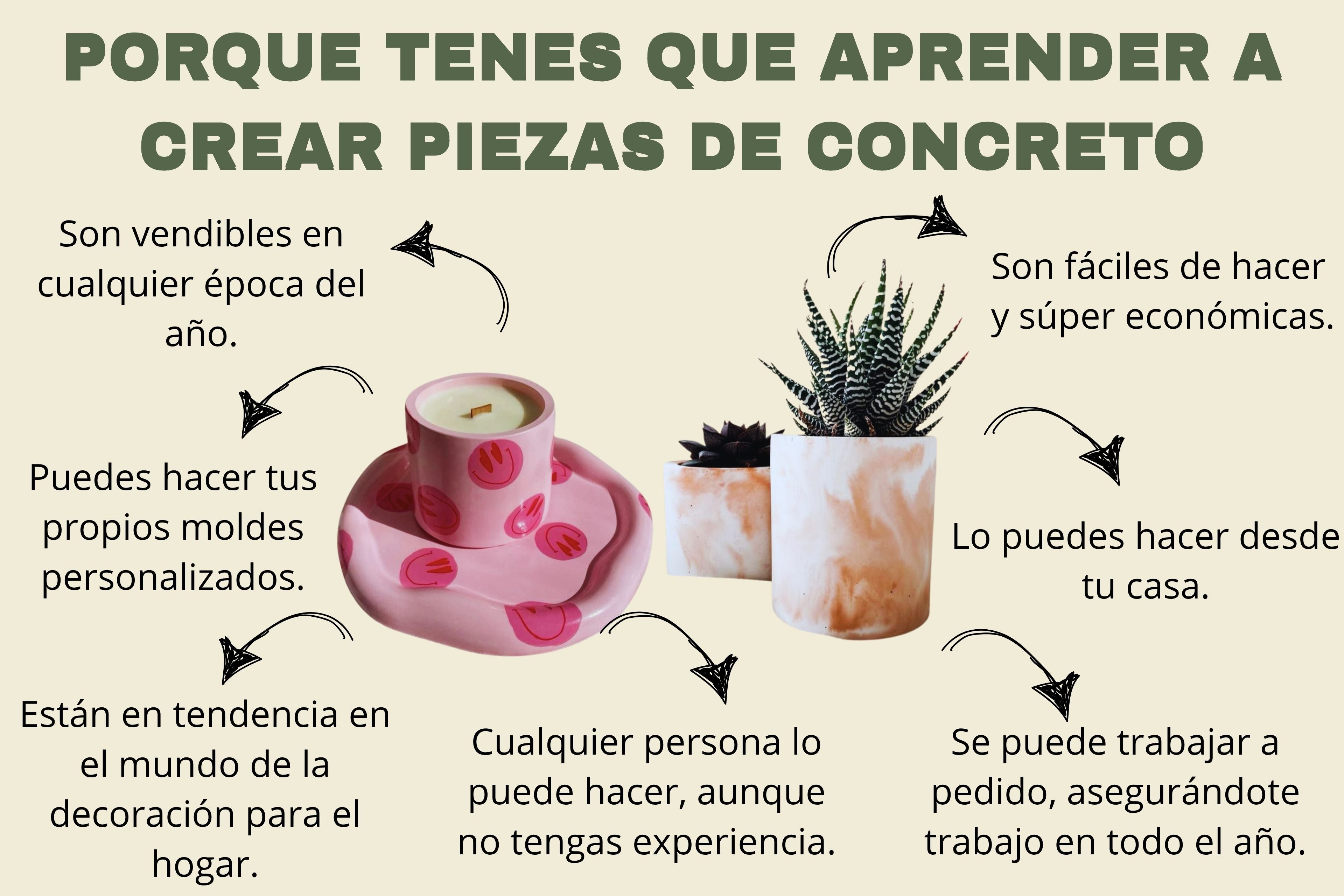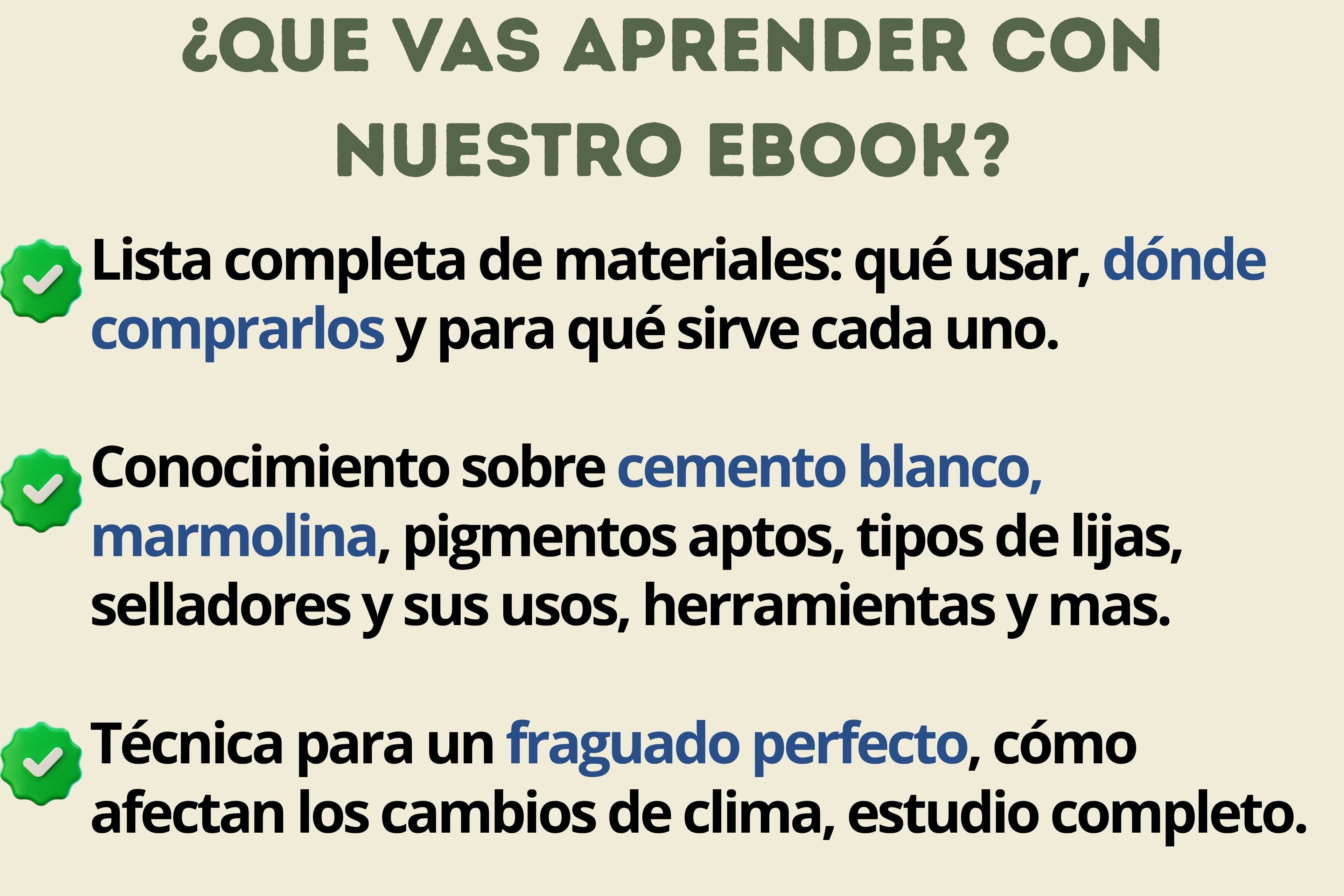 El ebook incluye toda la parte teórica para aprender desde cero a crear piezas decorativas en concreto y terrazzo, además de enlaces directos a clases grabadas paso a paso donde podrás ver todo el proceso en tiempo real. Tambien tendras nuestro numero de soporte para realizar preguntas.